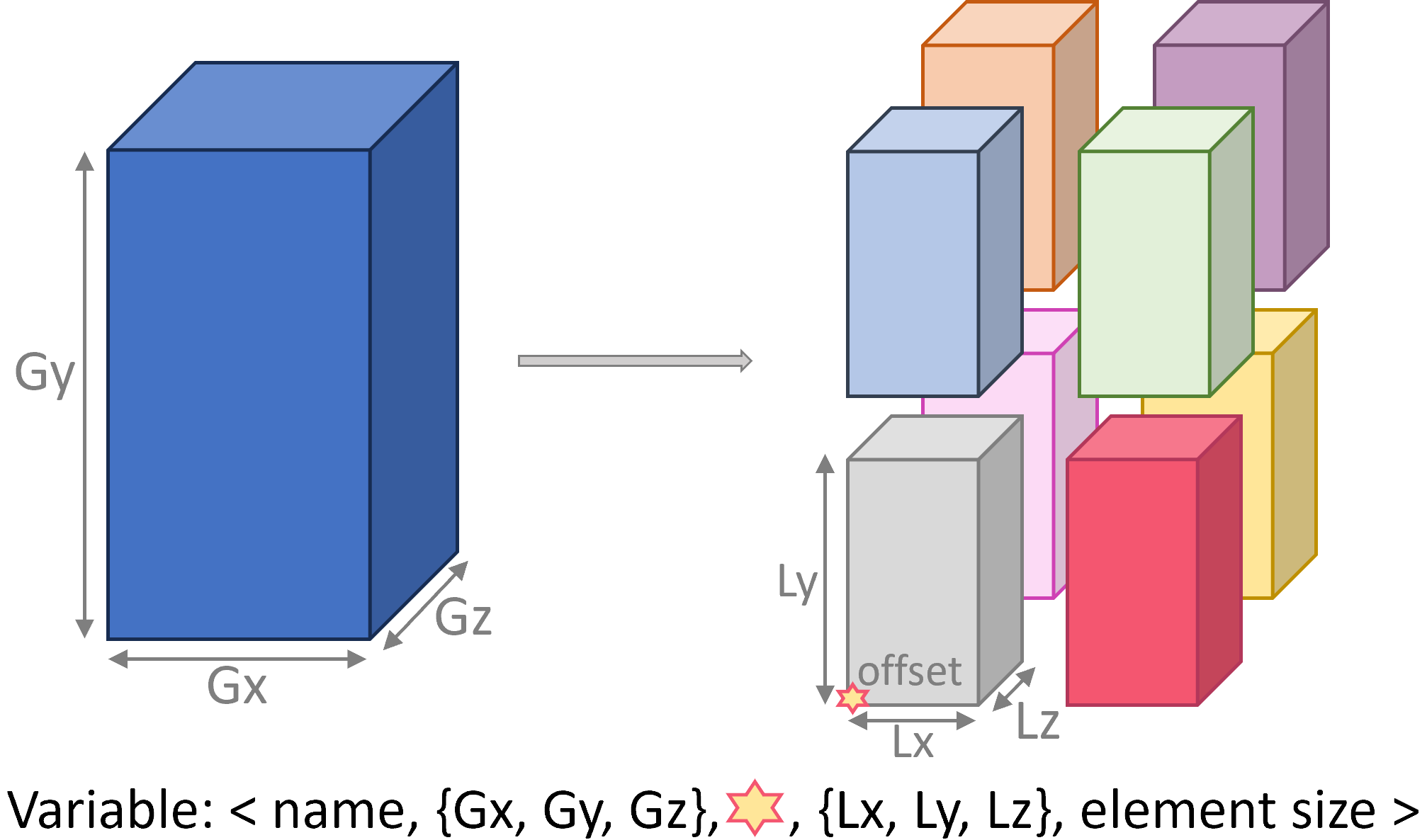 This tuple stores the name of the variable (that is unique to a given Stream), the global dimensions of the multidimensional array (\(G_x\), \(G_y\), and \(G_z\)) and, for each rank, the local part (\(L_x\), \(L_y\), and \(L_z\)) owned by that rank after decomposition and distribution, and a 3D-offset (represented by a star in the figure) that indicates where the local array is positioned in the global array. Finally, the tuple stores the size of the elements in the array.