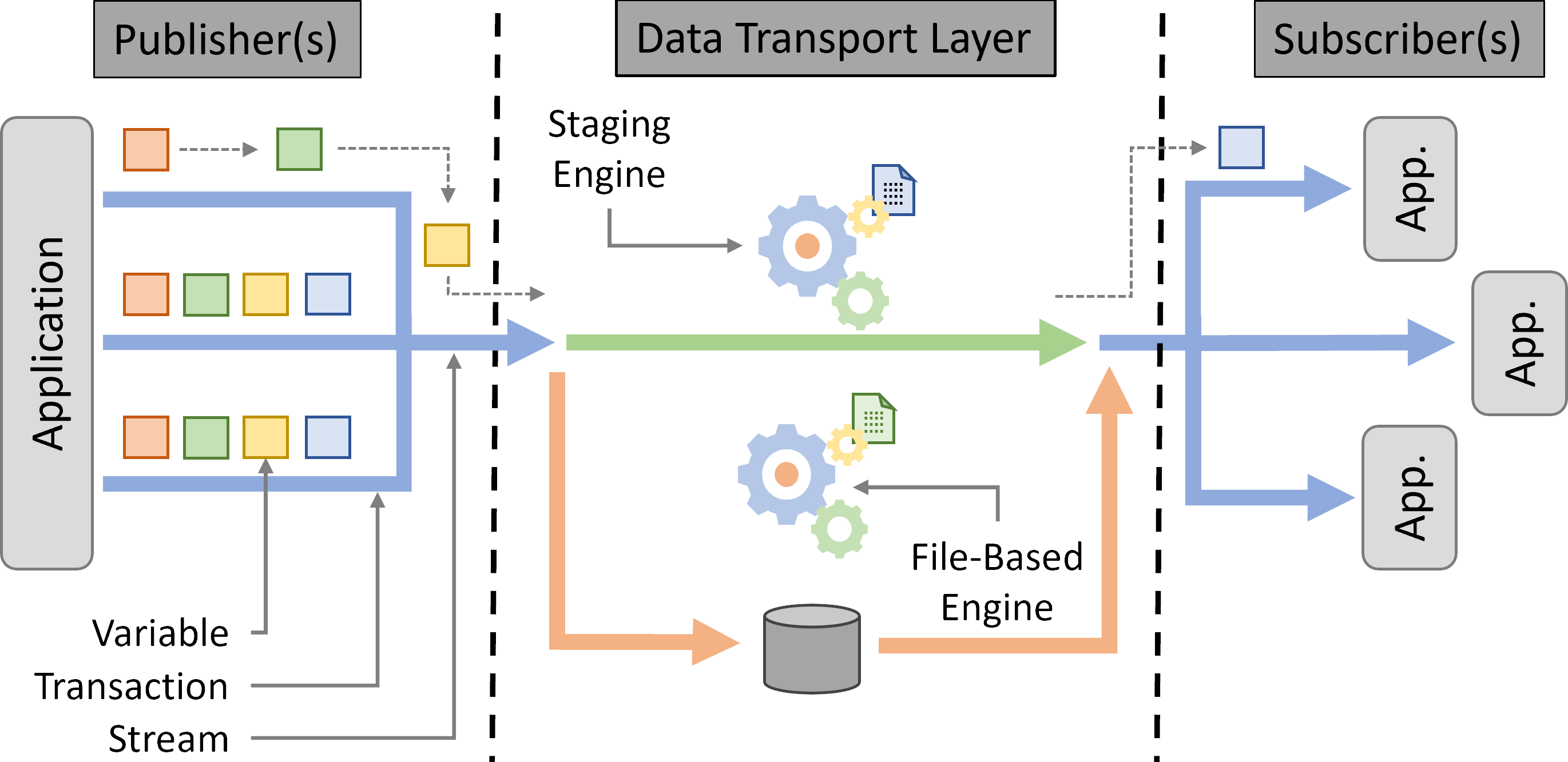 An engine is then associated to a specific Transport method that further specifies how data is written to and read from a file system or streamed from one workflow component to another. This separation between Engine and Transport method allows you to switch between multiple implementations of the same service without having to modify the code of your in situ workflow simulator: Changing of transport method simply amounts to modifying a configuration parameter of the Stream.